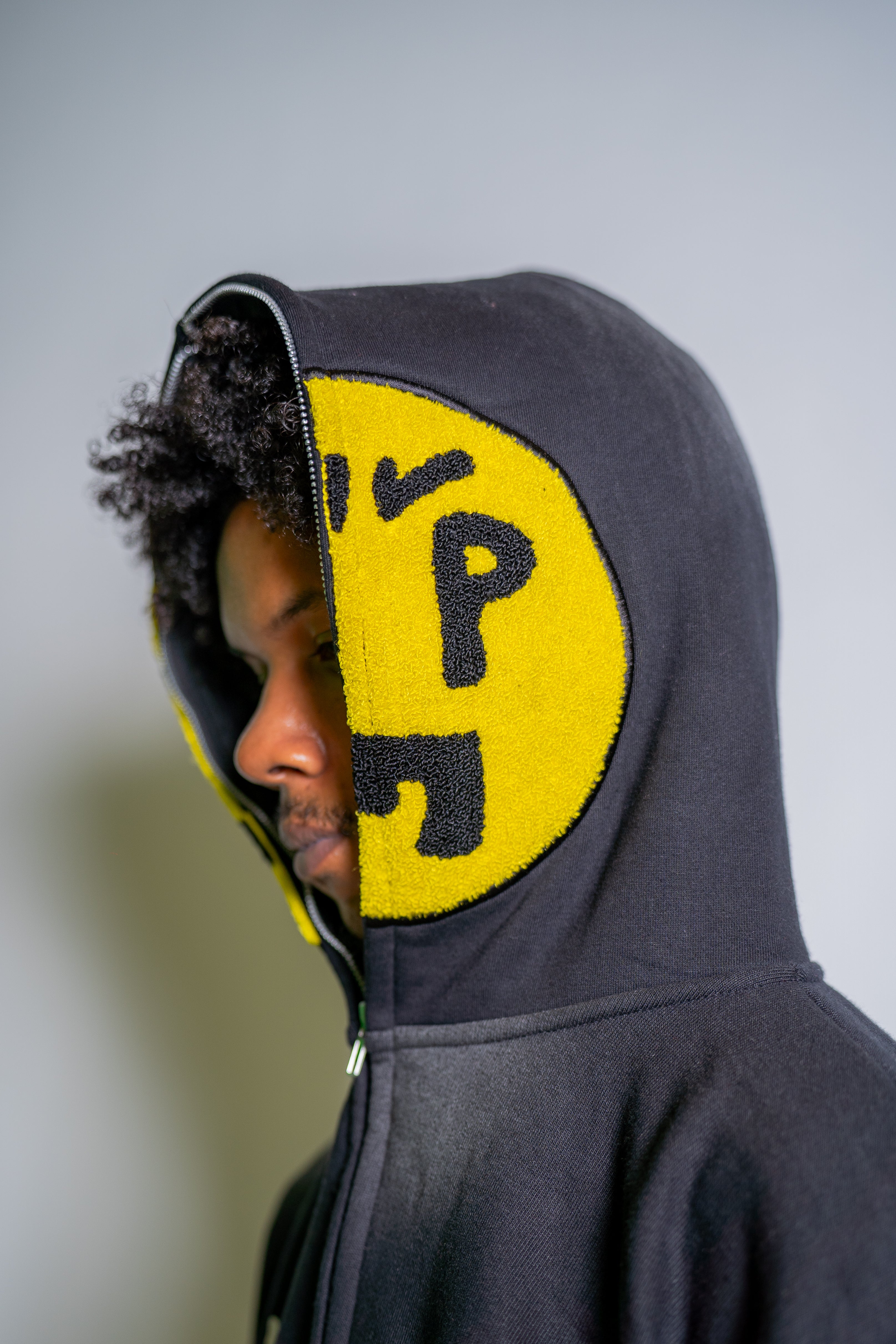 • Embroidered chenille “Face Emblem” patch on hood
